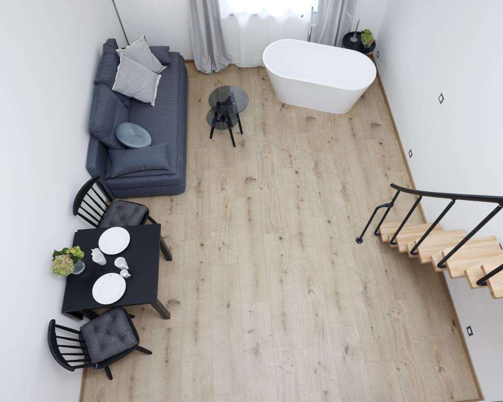 Nově zrekonstruovaný, vzdušný mezonetový apartmán, kde modrobílá porcelánová 3D tapeta s poletujícími racky vytváří pocit lehkosti a volnosti.